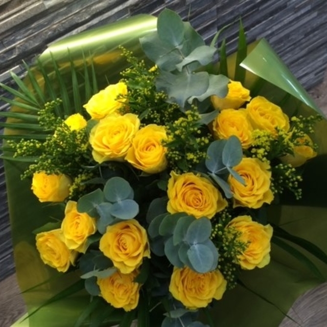 Our Gold strike large Rose Bouquet is a heavenly bunch of 12 x stunning sunshine yellow stems (Spray or standard) mixed together with crisp freshly picked foliage from our farm, hand made and lovingly wrapped by our florist.
